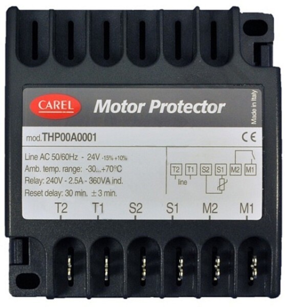 Защитный модуль предотвращает перегрев оборудования, отключая цепь через реле при превышении заданной температуры по сигналу PTC‑датчиков. Он применяется как штатный элемент безопасности в увлажнителях CAREL серии UR и совместим с логикой защиты двигателей/компрессоров, где используются PTC‑термодатчики. Благодаря встроенной выдержке на повторный запуск устройство исключает частые перезапуски и повышает надежность узла в тяжелых режимах эксплуатации.