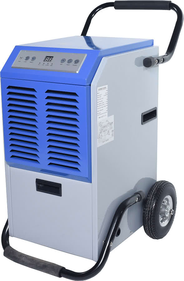 Мобильный осушитель воздуха промышленный конденсационного типа. Такие осушители находят широкое применение в строительстве и ремонте зданий, на складах, как промышленного назначения, так и бытового, подвальных помещениях, книгохранилищах, для сушки после затопления. На первом этапе влажный воздух пропускается через холодный теплообменник и влага осаждается в бак и дренажной помпой сливается. На втором этапе воздух пропускается через теплый теплообменник и нагревается, после чего подается в помещение.